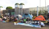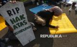Sejumlah orang mengikuti aksi damai memperingati Hari Bumi di depan Kompleks Parlemen, Jakarta, Jumat (24/4/2026). Aksi tersebut digelar dalam rangka memperingati Hari Bumi yang tahun ini memasuki peringatan ke-56. Kondisi bumi dinilai semakin memprihatinkan dan berada di ambang krisis bagi kehidupan makhluk hidup. Ancaman kenaikan suhu bumi sebesar 1,5 derajat Celsius pun dinilai belum mampu diatasi secara signifikan. (FOTO : Republika/Prayogi)