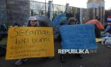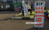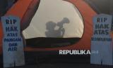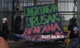 Sejumlah orang membentangkan spaduk saat mengikuti aksi damai memperingati Hari Bumi di depan Kompleks Parlemen, Jakarta, Jumat (24/4/2026). Aksi tersebut digelar dalam rangka memperingati Hari Bumi yang tahun ini memasuki peringatan ke-56. Kondisi bumi dinilai semakin memprihatinkan dan berada di ambang krisis bagi kehidupan makhluk hidup. Ancaman kenaikan suhu bumi sebesar 1,5 derajat Celsius pun dinilai belum mampu diatasi secara signifikan. (FOTO : Republika/Prayogi)