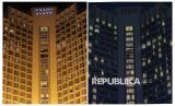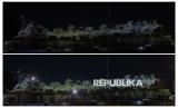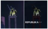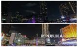 Foto kolase suasana pemadaman lampu di Hotel Kempinski saat pelaksanaan Hari Bumi (atas) dan sebelum dilaksanakan (bawah) di kawasan Bundaran Hotel Indonesia, Jakarta, Sabtu (25/4/2026). Pemprov DKI Jakarta melakukan pemadaman lampu secara serentak di lima wilayah dalam rangka menghemat energi pada peringatan Hari Bumi 2026 yang dilakukan selama satu jam dari pukul 20.30 hingga 21.30 WIB. (FOTO : Republika/Thoudy Badai)