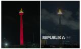 Foto kolase suasana pemadaman lampu pada Monumen Nasional (Monas) saat pelaksanaan Hari Bumi (kanan) dan sebelum dilaksanakan (kiri) di kawasan Monas, Jakarta, Sabtu (25/4/2026). Pemprov DKI Jakarta melakukan pemadaman lampu secara serentak di lima wilayah dalam rangka menghemat energi pada peringatan Hari Bumi 2026 yang dilakukan selama satu jam dari pukul 20.30 hingga 21.30 WIB. (FOTO : Republika/Thoudy Badai)